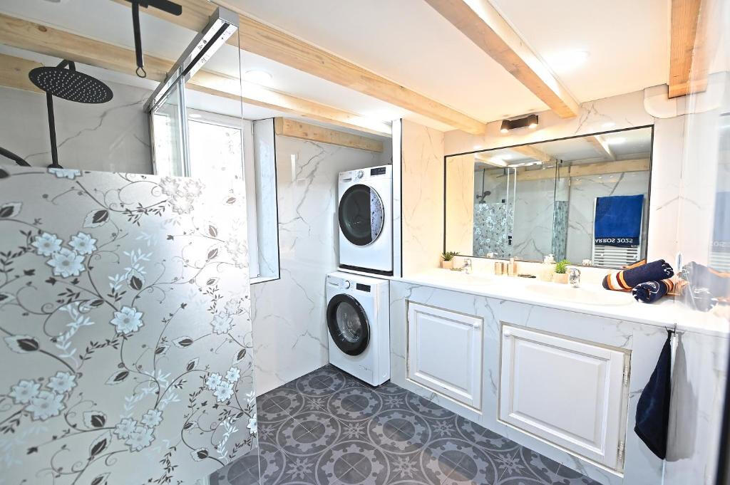 | CLIMATISEUR RÉVERSIBLE DANS LES 5 CHAMBRES ET SÉJOUR | 1 SALLE DE BAIN AVEC BAIGNOIRE BALNÉO ET LAVABO DOUBLE VASQUE AU RDC | 1 MACHINE À LAVER, 1 SÈCHE-LINGE, 1 FOUR, 1 LAVE-VAISSELLE |