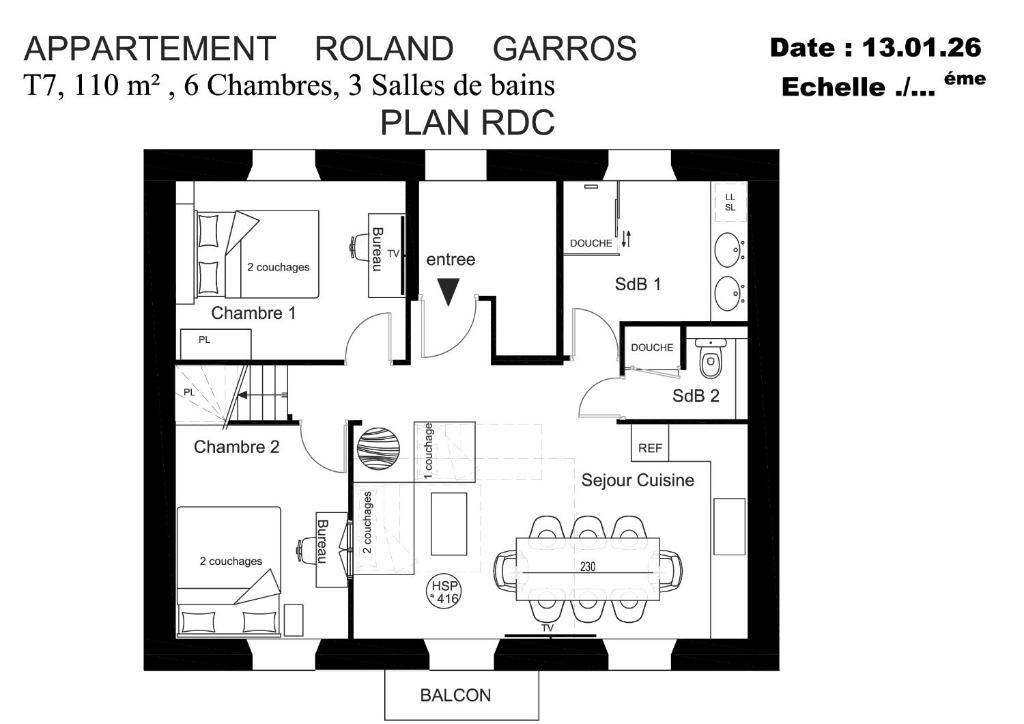 Il est composé d'une cuisine américaine, de 6 chambres, de 2 salles de bains, d'un WC indépendant, et d'un balconnet.
